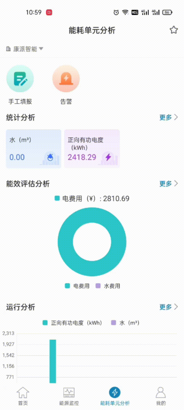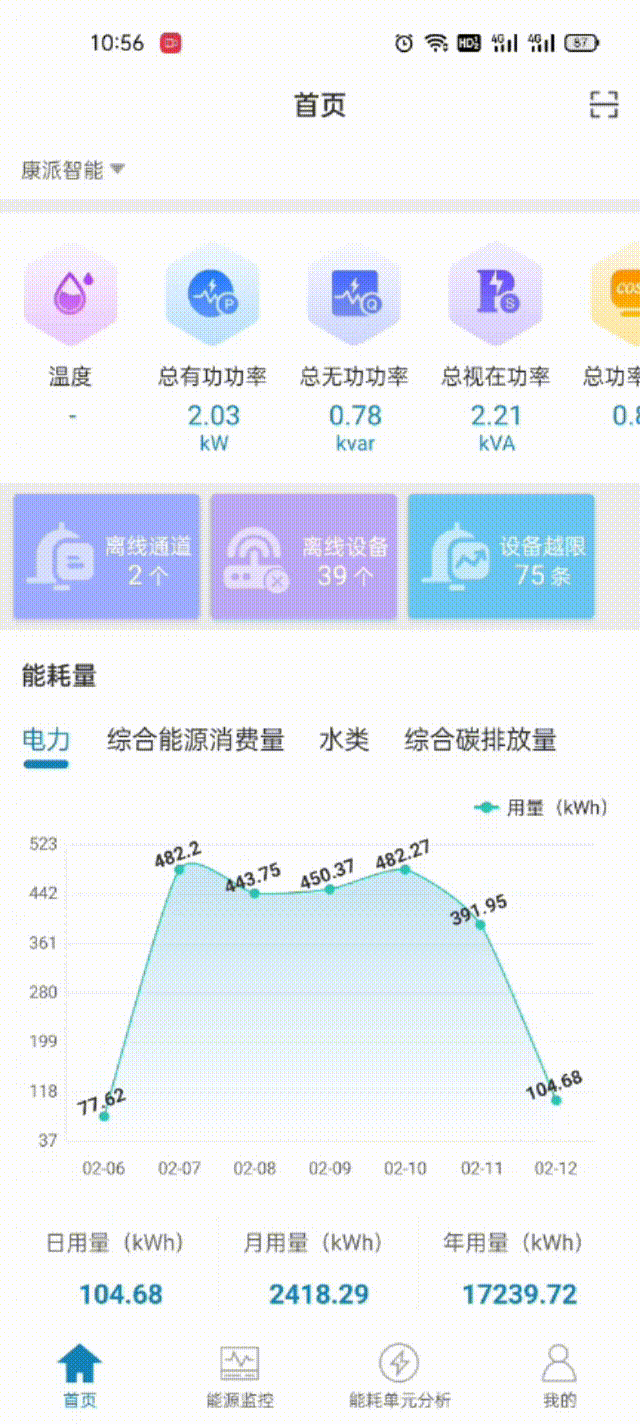 用電量、綜合能耗、碳排放量等能耗總覽,設備在線狀態預覽。
